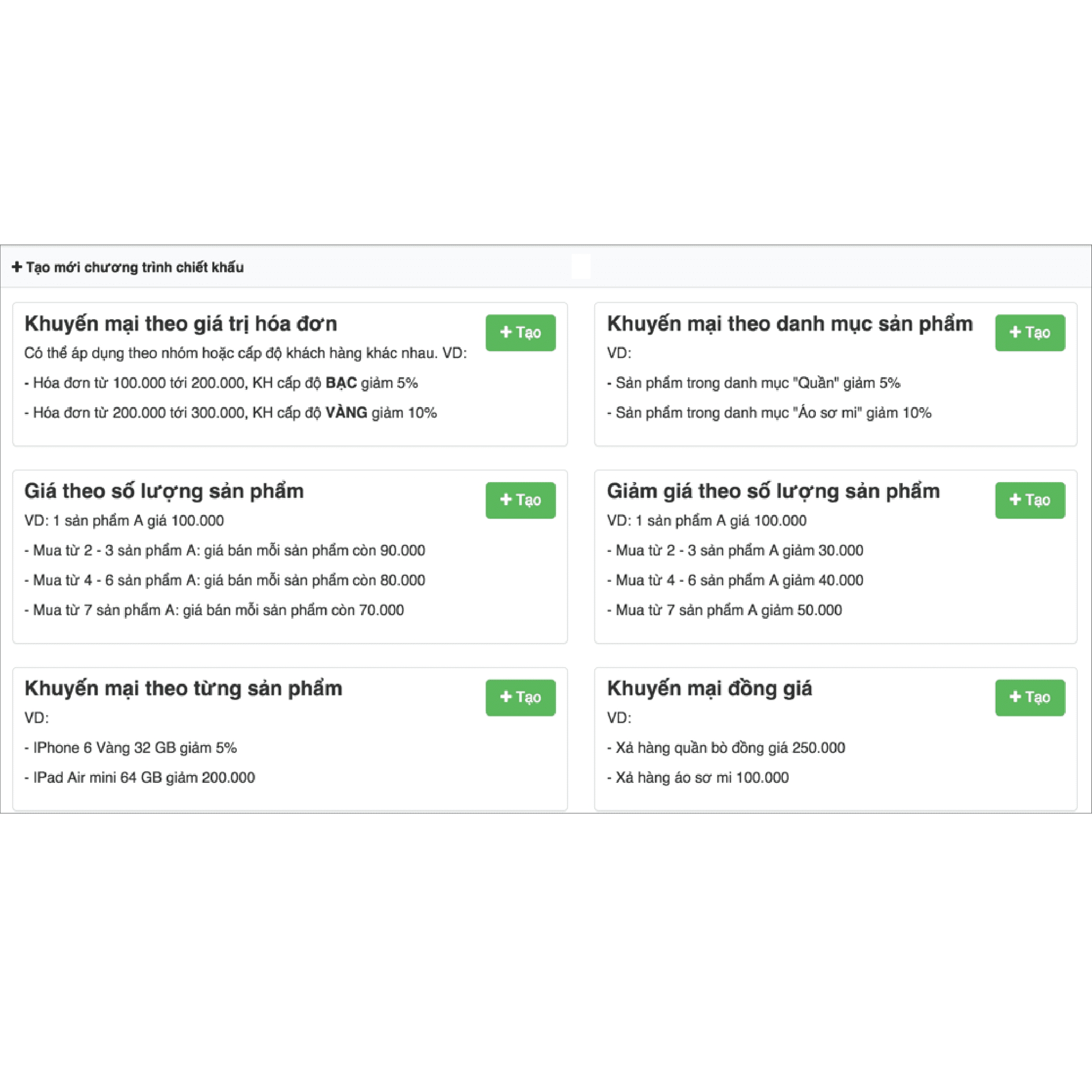 Linh hoạt cài đặt chương trình khuyến mại, tích điểm, chiết khấu theo nhiều tiêu chí.
